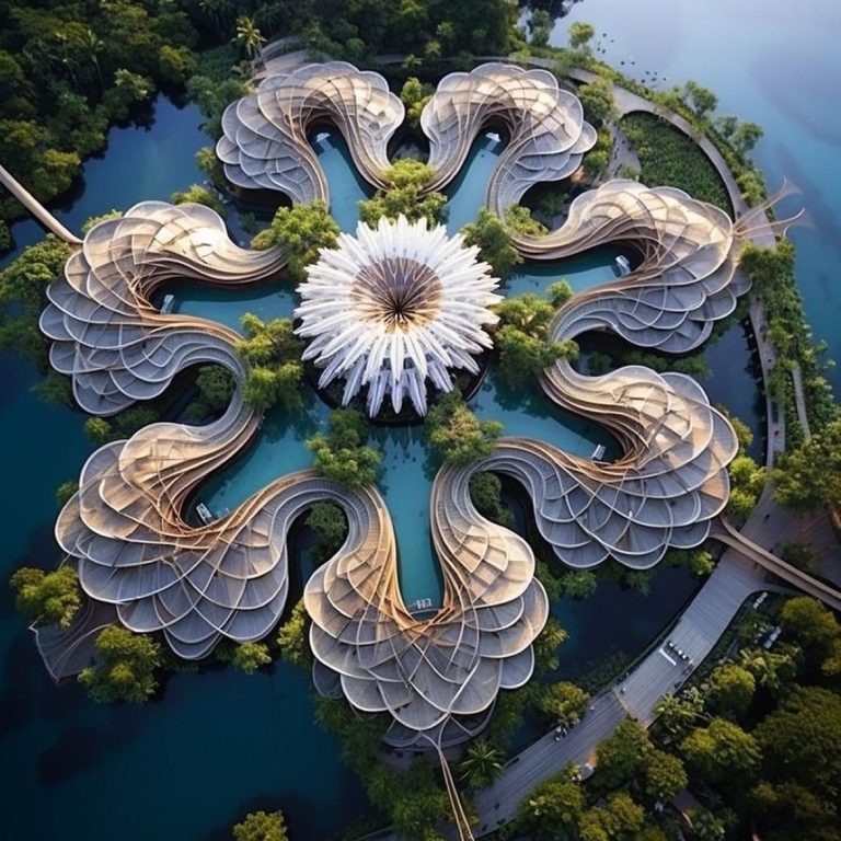 این ساختمان به شکل یک گل بزرگ با چندین پر گلی منحنی و موجدار طراحی شده است. هر یک از این “برگها” یک واحد مسکونی یا فضای کاربردی است که به صورت چرخان و متقارن حول مرکز گل قرار گرفتهاند. این طراحی مستقیماً از اصول معماری زیستی (Biomimicry) الهام گرفته شده است.